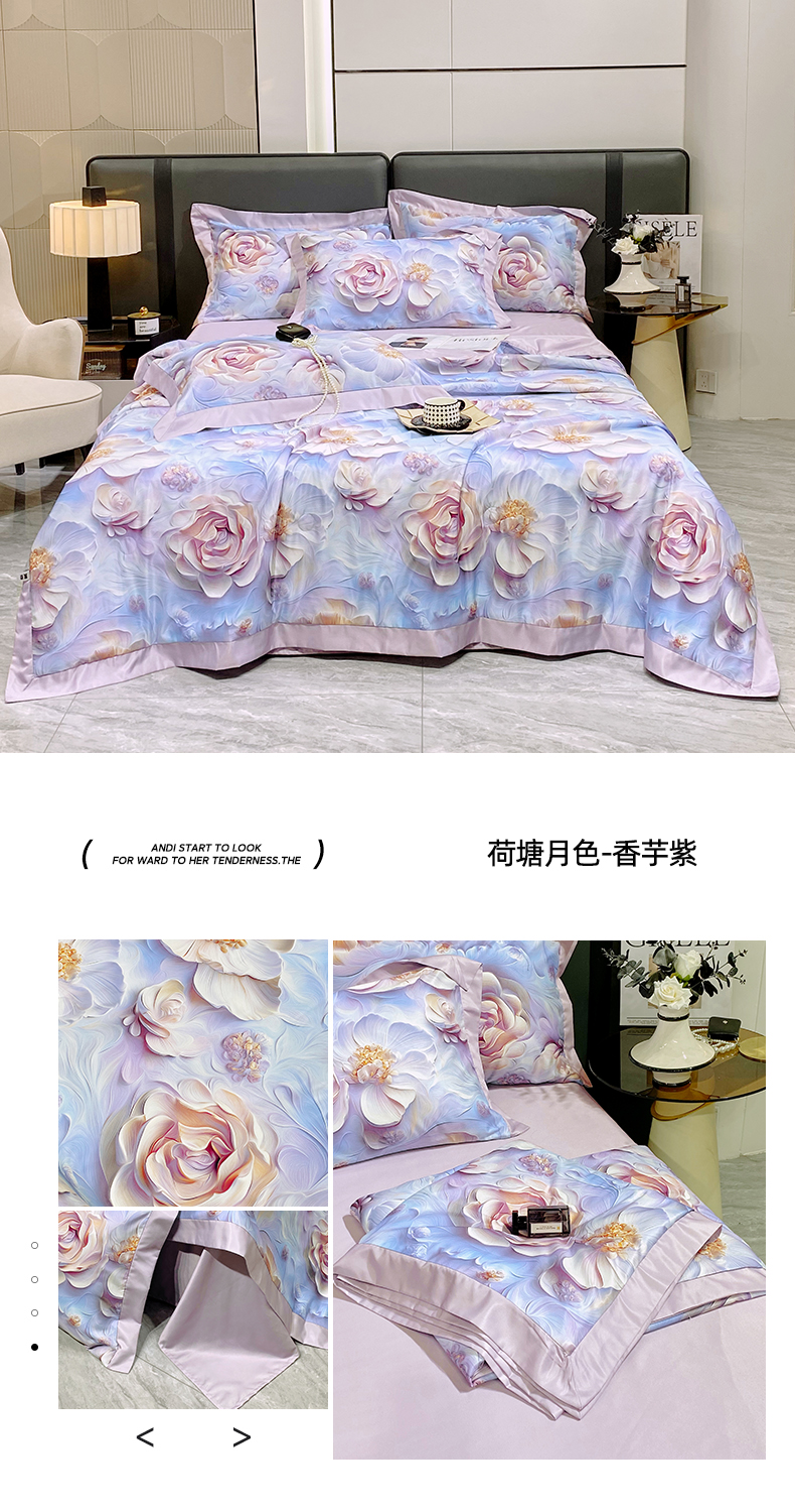 久久红 2025新款数码印花凉感冰丝羽丝棉填充夏被四件套 荷塘月色-紫